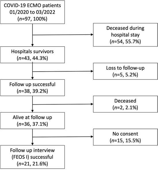 All patients treated for COVID-19 ARDS and supported with V-V ECMO were included (all-comer study). The following inclusion criteria were applied in FEOS: (1) SARS-CoV-2 detection by PCR or antibody test, (2) COVID-19 ARDS main diagnosis for ICU treatment, (3) V-V ECMO support for COVID-19 ARDS, and (4) age 18 years or above at ECMO cannulation. The following exclusion criterion was applied: (1) presentation after May 2022. All patients were therefore admitted between 30 March 2020 and 31 March 2022. All ICU survivors were contacted by mail between October and November 2022. The mailing included a cover letter providing information about the background, goals, and process of the research project. Patients were invited to participate in a follow-up examination and quality-of-life questionnaires. The mailing also included a declaration of consent or refusal and a stamped return envelope. After receiving written informed consent, appointments for the follow-up were scheduled between November 2022 and February 2023.