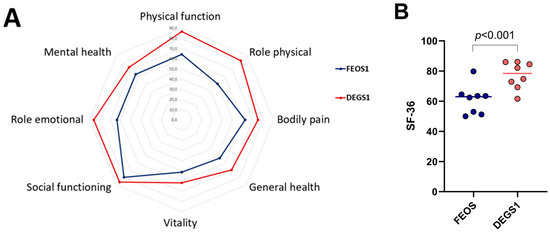 A total of 21 patients completed the SF-36 questionnaires. The SF-36 was filled out autonomously in 20/21 patients. In one case, the patient had difficulty opening the link, which required a procession of the SF-36 by phone. There was no difference between male and female patients concerning the SF-36 form. Comparing the SF-36 in our patient group to a German norm group evaluated in the DEGS1 study, we found significantly lower quality of life in our patient group (62.4 versus 77.2, respectively, p < 0.001); see Figure 2. Of the eight items compared in the SF-36 questionnaire, only four were significantly lower. Bodily pain, vitality, social role functioning, and mental health were similar between both groups; see Supplementary Table S1. Figure 3 shows a comparison of different sudies or meta-analyses of health-related quality of life using the SF-36 form in different patient collectives compared to FEOS.