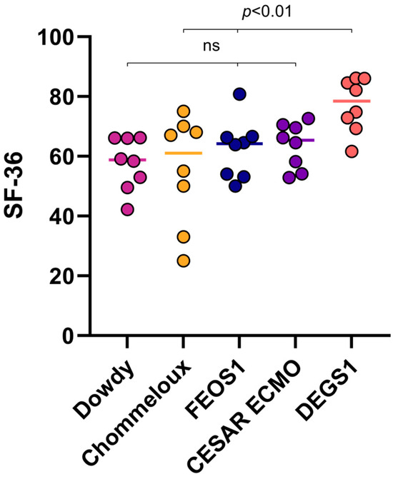 Also, COVID-19 might have played a role. Follow-up examinations without ECMO, both in patients with SARS-CoV2 pneumonia [27] and with COVID-19 ARDS requiring intensive care [28,29], showed significantly reduced values in the mental and physical score of the SF-36 questionnaire. This could underline the consequences of COVID as one reason for the poorer SF-36 values.