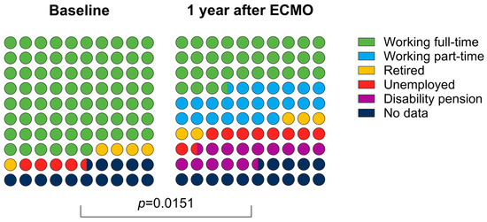 The working status changed significantly one year after ECMO compared to the status before the ARDS. Still, 12/21 (57%) could return to work either full- or part-time; see Figure 4.