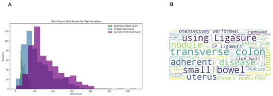 (A) Word count distribution of text variables. The variation reflects the different purposes of the fields. (B) Word cloud visualisation of the concatenated texts extracted from operative notes and operative findings. More frequent terms appear larger.