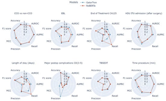 Radar plots comparing performance between RoBerta and GatorTron models for all examined clinical tasks using Matthew’s correlation coefficient (MCC), recall, precision, F1 score, accuracy, area under precision–recall curve (AURPC), and area under receiver operating characteristic curve (AUROC).
