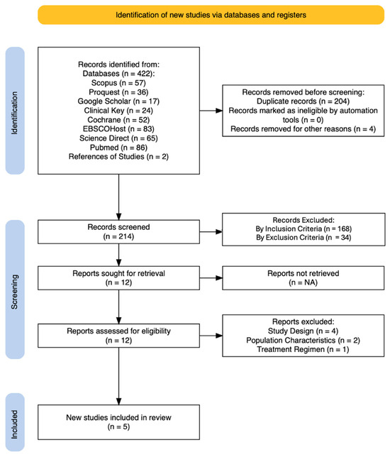 The literature search results are summarized in the form of a PRISMA flow diagram (Figure 1). A total of 5 clinical studies are included in this systematic review [16,17,18,19,20].