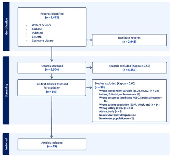The search query identified 5504 unique records, of which 5357 records were excluded after review of the titles and abstracts. The Kappa for the initial screening was 0.55. Of the 147 full-text article reviews, 98 were excluded (Kappa = 0.60) for the reasons listed in Figure 1, leaving a total of 49 articles [9,18,19,20,21,30,31,32,33,34,35,36,37,38,39,40,41,42,43,44,45,46,47,48,49,50,51,52,53,54,55,56,57,58,59,60,61,62,63,64,65,66,67,68,69,70,71,72,73]. Several studies passed initial screening, but were excluded during the full-text review because they consisted of a majority IHCA (i.e., >50%) or they included both IHCA and OHCA but did not specify a percentage of each [74,75,76].
