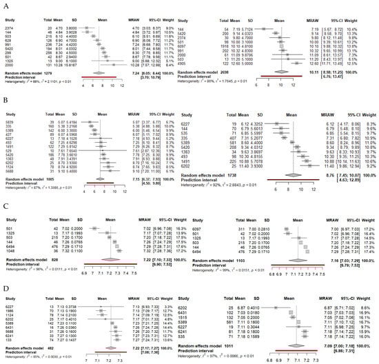 Seven articles compared pH levels with survival outcome. Six studies were retrospective studies, while one was a prospective observational study for a total of 4077 patients (favorable survival, 1139; poor survival, 2305). Outcome duration ranged from hospital admission to 28-day survival. Means and standard deviations were deduced for four studies. In the final model (n = 1931), a mean pH of 7.16 (95%CI: 7.03–7.29, p < 0.0001) was associated with poor neurological outcome, while a mean pH of 7.22 (95%CI: 7.10–7.33, p < 0.0001) was associated with favorable survival (Table 2, Figure 2C).