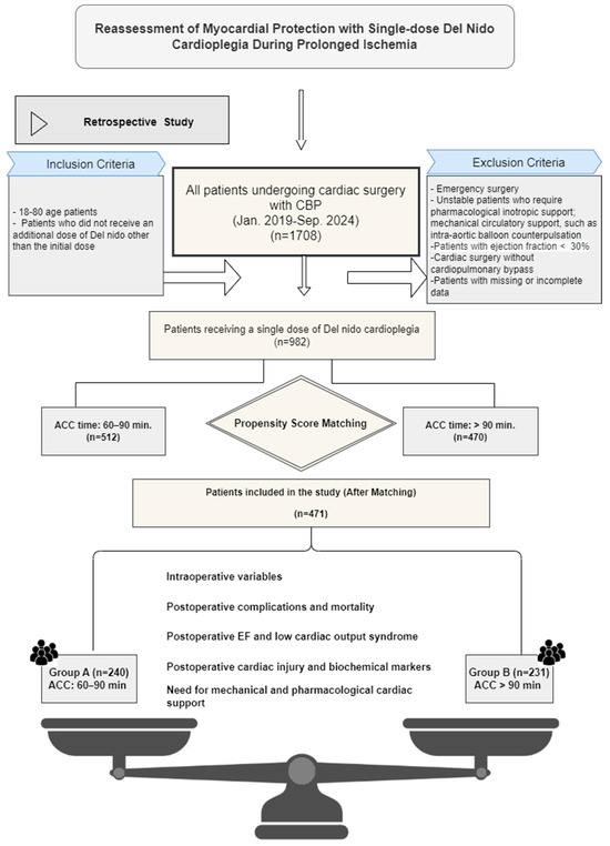 This study included patients who received only a single dose of DN cardioplegia. Those who required additional doses for any reason, regardless of the aortic cross-clamp (ACC) duration, were excluded (Figure 1).