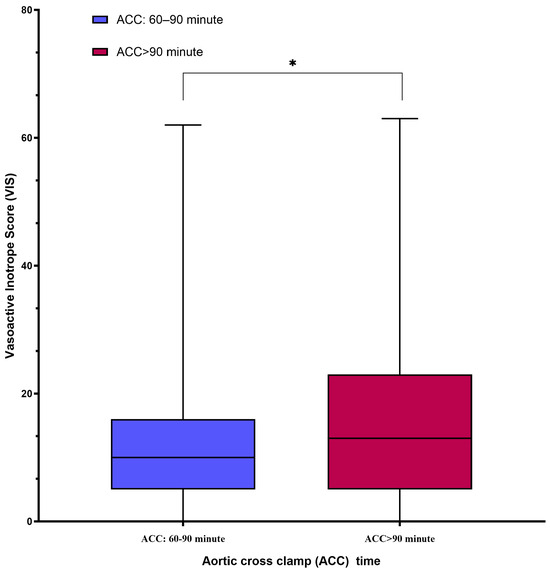 In cardiac surgery, while the use of inotropes is often necessary intraoperatively, the surgical procedure performed outside of the aortic cross-clamp (ACC) period can be influenced by various factors such as patient characteristics [24,25]. The group with prolonged ACC times exhibited higher vasoactive–inotropic scores (VISs), which have been associated with increased morbidity, longer ICU stays, and extended durations of mechanical ventilation. Moreover, studies have demonstrated that longer-than-average ACC times are linked to an increased use of inotropic drugs and a greater need for intra-aortic balloon pump (IABP) support [26,27].