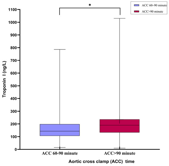 Box-plot graph comparing troponin I (Trop-I) levels in the first 24 h postoperatively in both ischemic time intervals: TnI levels were significantly higher in the group with an aortic cross-clamping time >90 min in the postoperative first 24 h. * p < 0.05.