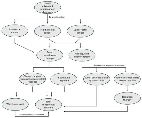 The management of locally advanced rectal cancer (LARC), defined as American Joint Committee on Cancer (AJCC) TNM stage II and III rectal cancer, has undergone significant advancement over time [,]. The adoption of a multidisciplinary approach to the management and surveillance of LARC, including neoadjuvant chemotherapy with radiation therapy, high resolution pelvic magnetic resonance imaging (MRI), and the introduction of total mesorectal excision (TME), has significantly advanced how the disease is managed [,,,,]. Total neoadjuvant therapy (TNT), which combines neoadjuvant chemotherapy with concurrent chemoradiation therapy prior to surgical resection has improved the oncological outcomes of patients with LARC [,,]. With TNT, 25–50% of patients may achieve a clinical complete response (cCR), defined as no palpable tumor on digital rectal examination, no visible tumor on endoscopy, and no evidence of disease on cross-sectional imaging [,,,,]. These observations have led to the emergence of a non-operative management strategy, termed watch-and-wait (W&W), for patients who have achieved a cCR after TNT.