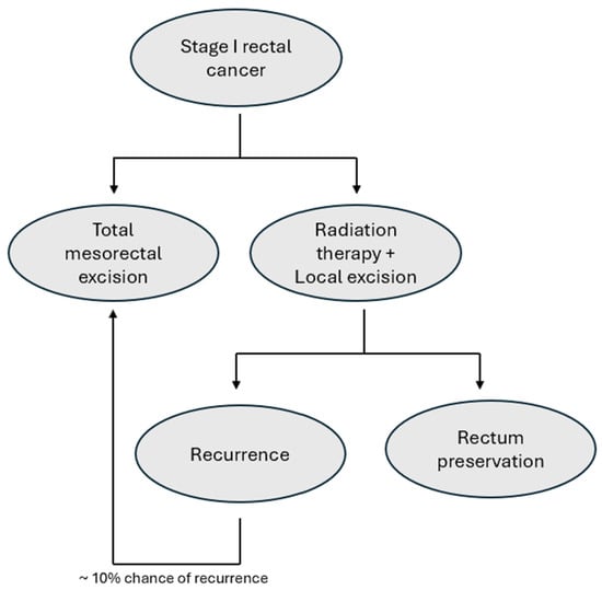 - Bach, S.P.; Gilbert, A.; Brock, K.; Korsgen, S.; Geh, I.; Hill, J.; Gill, T.; Hainsworth, P.; Tutton, M.G.; Khan, J.; et al. Radical Surgery Versus Organ Preservation Via Short-Course Radiotherapy Followed by Transanal Endoscopic Microsurgery for Early-Stage Rectal Cancer (TREC): A Randomised, Open-Label Feasibility Study. Lancet Gastroenterol. Hepatol. 2021, 6, 92–105. [Google Scholar] [PubMed]