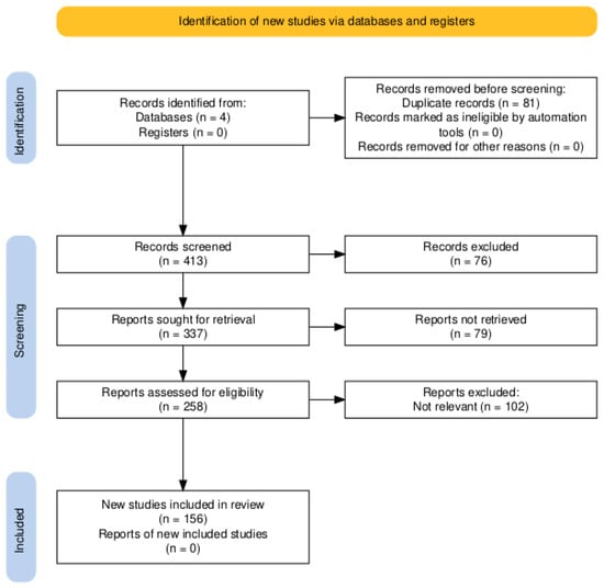 PRISMA flow diagram illustrating the selection process, resulting in the inclusion of 156 studies after screening and eligibility assessments.
