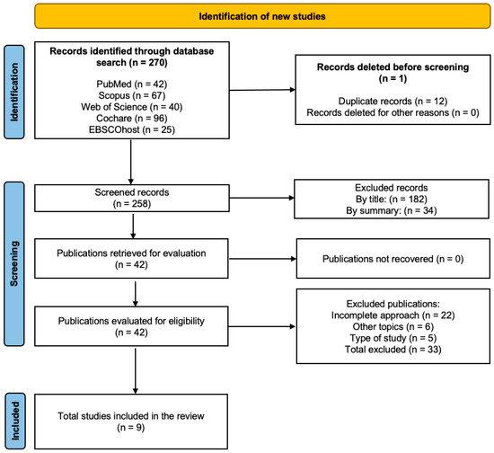 A total of 270 studies were identified through the database search, with 12 excluded due to duplication. Of the remaining 258 records, 216 were excluded after reviewing titles and abstracts for relevance. Following a full-text review of the 42 references, 33 studies were excluded for not meeting the predetermined inclusion criteria, 22 for including incomplete approaches, six for unrelated topics, and five for not being RCTs. Ultimately, nine studies [30,31,32,33,34,35,36,37,38] were analyzed using the PICOS framework. The search results are presented in a flowchart in accordance with the PRISMA guidelines, as shown in Figure 1 [39].