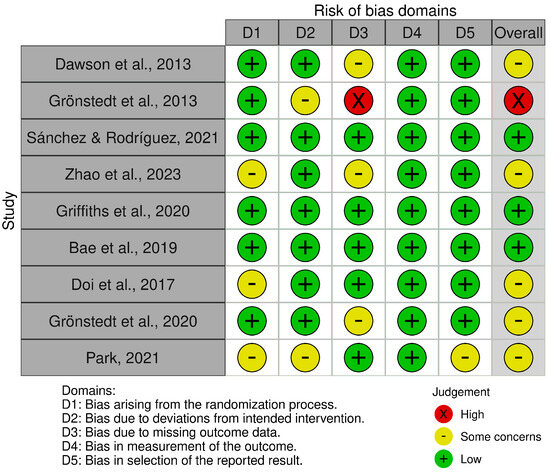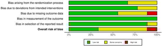 - Higgins, J.P.T.; Savović, J.; Page, M.J.; Elbers, R.G.; Sterne, J.A.C. Chapter 8: Assessing risk of bias in a randomized trial. In Cochrane Handbook for Systematic Reviews of Interventions; Higgins, J.P.T., Thomas, J., Chandler, J., Cumpston, M., Li, T., Page, M.J., Welch, V.A., Eds.; John Wiley & Sons: Chichester, UK, 2023; version 6.4. [Google Scholar]
