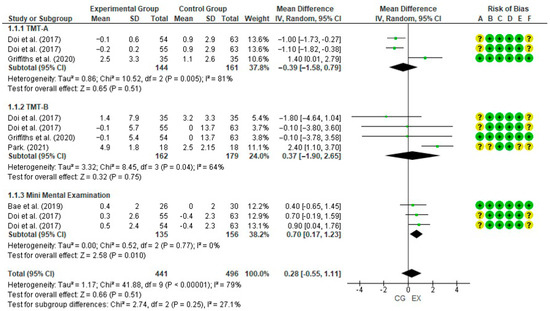 Experimental group has an effect compared to control group on the following outcomes: Trail Making Test A (TMT-A), Trail Making Test B (TMT-B), and Mini-Mental Examination. Squares indicate the study-specific effect estimate. Bars indicate the width of the corresponding 95% confidence interval. The diamond/rhombus is centered on the summary effect estimate, and the width indicates the corresponding 95% confidence interval. EX: experimental group; CG: control group; +: low; ?: some concerns [34,35,36].