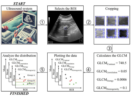 Figure 1 shows a simplified scheme for determining kidney and gallbladder stones in the acoustic shadow area using GLCM features. Briefly, images of the kidney and gallbladder were acquired using a diagnostic ultrasound imaging modality. The region of interest (ROI) was set to the shadow that occurs behind the area determined to be a stone in the acquired ultrasound image (Figure 1 ①). The size and location of the ROI were chosen by the users based on their experience. The selected ROIs were cropped to create a single patch, and the process was repeated on the images of patients with known or suspected kidney and gallbladder stones (Figure 1 ②). The GLCM function was calculated based on the obtained patches.