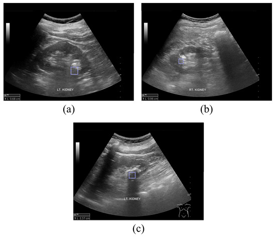 Kidney stone ultrasound images acquired for GLCM analysis. Sample ultrasound images of suspected kidney stones, with probabilities of (a) 50–60%, (b) 60–80%, and (c) ≥80%, analyzed by doctors and sonographers.