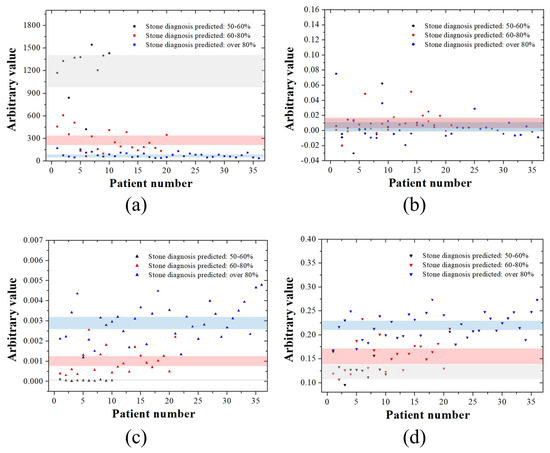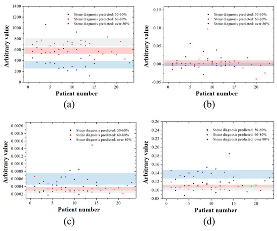 Figure 3 shows the arbitrary values for each kidney stone ultrasound image according to the four characteristics of the GLCM. The mean values were calculated to be 743.31 [95% CI, 676.68–809.94], 582.93 [95% CI, 535.89–629.97], and 328.70 [95% CI, 269.90–387.51] for kidney stone ultrasound images with a 50–60%, 60–80%, and ≥80% probability, respectively. The mean values were 0.0151 [95% CI, −0.0032–0.0126], 0.0041 [95% CI, −0.0057–0.0140], and 0.0050 [95% CI, −0.0042–0.0008] for kidney stone ultrasound images with a 50–60%, 60–80%, and ≥80% probability, respectively. The mean values were 0.000288 [95% CI, 0.000253–0.000324], 0.000351 [95% CI, 0.000308–0.000393], and 0.000615 [95% CI, 0.000470–0.000761] for kidney stone ultrasound images with a 50–60%, 60–80%, and ≥80% probability, respectively. The mean values were 0.1054 [95% CI, 0.1010–0.1099], 0.1121 [95% CI, 0.1072–0.1171], and 0.1376 [95% CI, 0.1283–0.1468] for kidney stone ultrasound images with a 50–60%, 60–80%, and ≥80% probability, respectively. By analyzing the CI area in black (50–60%), red (60–80%), and blue (≥80%), we confirmed that was clearly divided into three types (Figure 3a). showed almost no distinction between the three color shades based on the CI values (Figure 3b). Some boundaries and separation areas were observed in and (Figure 3c,d).