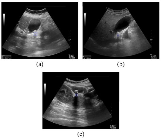 Gallbladder stone ultrasound images acquired for GLCM analysis. Sample ultrasound images of suspected gallbladder stones, with probabilities of (a) 50–60%, (b) 60–80%, and (c) ≥80%, analyzed by doctors and sonographers.