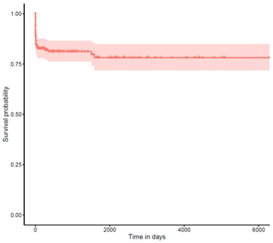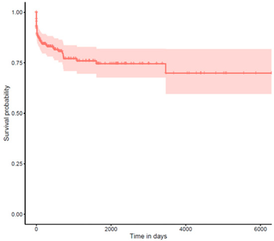 For long-term complications (glaucoma and retinal detachment), we performed time-to-event analyses using the Kaplan–Meier method (see Figure 2 and Figure 3). Time was calculated from the date of surgery until either the occurrence of the complication or the last documented follow-up visit (censoring). Median survival times with 95% confidence intervals were calculated where the event rate allowed.