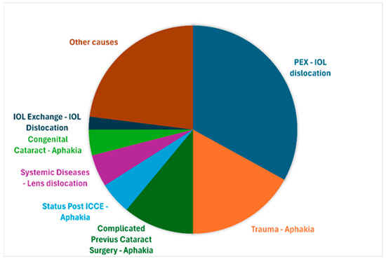 The predominance of IOL dislocation due to pseudoexfoliation syndrome (33.1%) as the primary indication aligns with the previous literature [1,9,15,18] and underscores the importance of the early recognition of zonular weakness in these patients. The substantial proportion of trauma cases (17.5%) reflects both the tertiary nature of our center and the particular utility of suture fixation in managing complex traumatic cases where conventional IOL placement is not feasible.