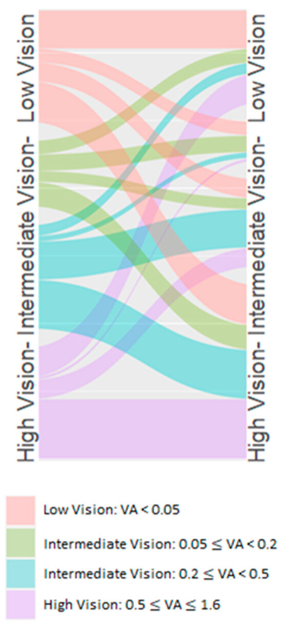 Visual outcomes were analyzed in two ways: First, raw visual acuity values were summarized using medians and ranges. Second, to visualize patterns of visual change, we created a Sankey diagram by categorizing visual acuity into four groups (≤0.05, >0.05–0.20, >0.20–0.50, and >0.50–1.60) and tracking transitions between preoperative and postoperative states.