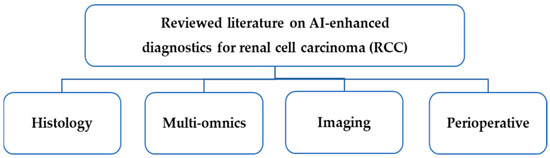 In this article, we present the results of a literature review on emerging AI-based models for RCC diagnostics in four areas of use: histological analysis, multi-omics, imaging, and perioperative planning. Figure 1 summarizes four areas of AI-enhanced diagnostics for RCC that were identified in the reviewed literature.
