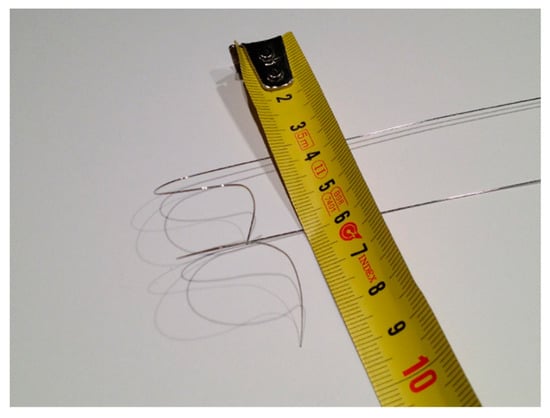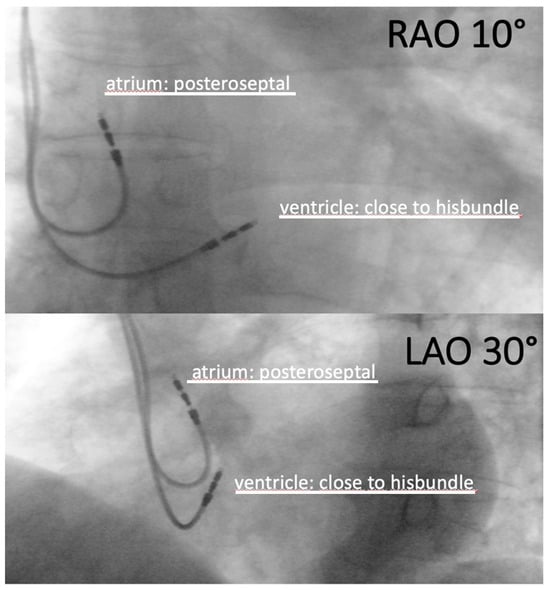 Placement of the leads was performed as prescribed previously [3,4]. Briefly, we modified the standard guide wire of the atrial pacemaker electrode (Medtronic 5076-52, Dublin, Ireland or Biotronik Solia S 53, Berlin, Germany) according to a specific 3D morphology, as illustrated in Figure 1. Then, we introduced this guide wire into the electrode working channel and maneuvered it into a posteroseptal position using a.p., RAO 10° and LAO 30° fluoroscopy. Lead placement in the posteroseptal position was verified in the LAO 30°, as illustrated in Figure 2, and the electrode was screwed into the atrial myocardium. Complete screwing was verified using fluoroscopy in LAO 30°. The specific preformed guide wire was then removed from the electrode, and the stable lead position was verified using a straight 52 cm guide wire. After successful confirmation of stable posteroseptal electrode implantation, the electrode was fixed on the sleeve using 2.0. Mersilene sutures. Finally, stimulated p-wave duration in the ecg monitoring was compared to intrinsic p-wave duration (maclab software, GE-Healthcare, Boston, MA, USA). The rest of the procedure was performed, as previously described, according to current guidelines and best clinical practice [6]. We used pacemakers from various manufacturers, such as Biotronik (Biotronik, Berlin, Germany) or Medtronic (Medtronic 5076-52, Dublin, Ireland). The decision whether to use Non-BB-P or BB-P in a specific patient was dependent on either the physician’s expertise, since BB-P is more challenging to achieve, or the stability of the electrode position in BB-P patients during implantation. Sometimes, BB-P could not be achieved; therefore, Non-BB-P was used. In general, BB-P was preferably used in patients with an expected high atrial stimulation percentage, such as sick sinus syndrome.