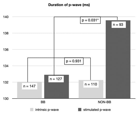 The intrinsic p-wave duration of the overall cohort was 132.1 ± 22.4 ms, n = 257. In detail, the mean intrinsic p-wave duration in the BB-P group was 132.0 ± 22.0 ms, n = 147, in comparison to 132.3 ± 23.1 ms, n = 110, p = n.s., in patients treated with Non-BB-P. This ensured comparability between the groups. The BB-P patients had a significantly shorter stimulated p-wave duration compared to the Non-BB-P patients (BB-P: 132.9 ± 23.7 ms, n = 127 vs. Non-BB-P: 139.6 ± 23.4 ms, n = 93, p = 0.031), as shown in Figure 3. Additionally, we found no significant increase in the stimulated p-wave duration in comparison to the intrinsic p-wave in the patients with BB-P (BB-P intrinsic: 131.0 ms +/− 20.8 ms, n = 115 vs. BB-P stimulated: 132.6 ± 22.9 ms, n = 115 p = n.s.). Please note that for this analysis, only n = 115 patients in the BB-P group could be used since these BB-P patients had values both for stimulated and intrinsic p-wave duration. This underlines the physiologic stimulation as well as a successful implantation regime in this study. Finally, we were able to show that in the Non-BB-P patients, the stimulated p-waves were significantly longer vs. their intrinsic p-waves (Non-BB-P intrinsic: 131.9 ± 23.8 ms, n = 78 vs. Non-BB-P stimulated: 140.7 ± 24.4, n = 78 p = 0.041), indicating potential proarrhythmic effects. Please note that for this analysis, only n = 78 patients in the Non-BB-P group could be used since these Non-BB-P patients had values both for stimulated and intrinsic p-wave duration.