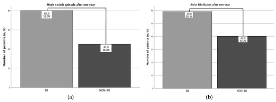 The evaluation of the pacemaker follow-up examinations in this study neither showed a statistically significant impact of the atrial lead placement on the incidence of atrial fibrillation after one year nor the occurrence of atrial high-frequency episodes. Additionally, interrogation of the pacemaker revealed a significant difference with regard to mode switch episodes in Non-BB-P vs. BB-P (Non-BB-P: 45 (38.8%), n = 116 vs. BB-P: 80 (51.9%), n = 154, p = 0.032, Table 5, Figure 4).