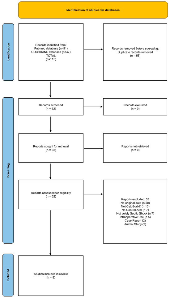 A systematic literature search was conducted in PubMed and COCHRANE on 10 June 2024 using the following key terms: “CytoSorb AND septic shock AND control group OR randomized”. Studies were included if they investigated CytoSorb® in adult or pediatric septic shock patients with a control group, encompassing both RCTs and observational studies. Exclusion criteria included studies unrelated to CytoSorb®, case reports, case series, animal studies, those without a control arm, or lacking original data. Reference lists of relevant articles were screened for additional studies. Filters were applied to exclude studies focusing on non-septic shock conditions, non-interventional studies, and those without clinical outcome data.