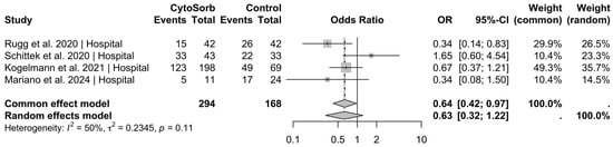 In-hospital mortality. A pooled analysis of data from four studies (total patient count, n = 462) reporting on in-hospital mortality indicated that the use of CytoSorb® was associated with a statistically significant reduction in mortality in the common effect model (OR = 0.64, 95% CI [0.42; 0.97], p = 0.036) [22,23,25,28].