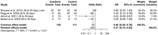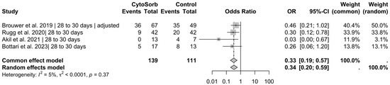 Results for 28 to 30 days of mortality. Pooled data from 4 publications with a total of 250 patients showed that using CytoSorb® was associated with a significant reduction in mortality using the common effect model, with an odds ratio of 0.33 (95% CI [0.19; 0.57], p < 0.001 [20,22,24,27].