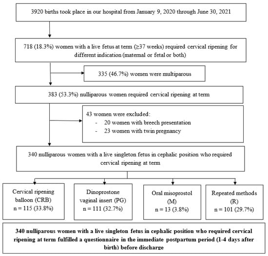 During the study period, 3920 births and 502 cesarean deliveries (12.8%) were recorded in our tertiary public hospital, and 718 women (18.3%) with a live fetus at term required cervical ripening for different indications (maternal or fetal or both) in our hospital. Among these women, 340 were nulliparous women and were finally included in this study (Figure 1).