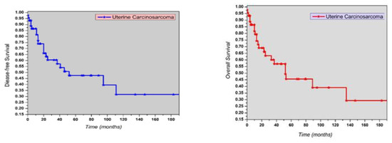 Kaplan–Meier curves for disease-free survival (DFS) and overall survival (OS) in women with uterine carcinosarcoma.