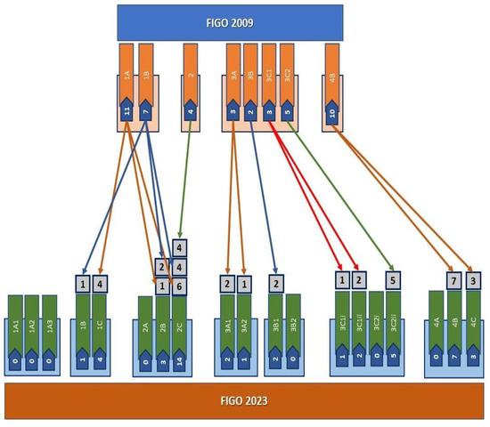 Stage shifts in study cohort of 45 UC patients according to 2009 and 2023 FIGO staging systems without molecular classification. Each colored arrow represents the reclassification of patient subgroups from the 2009 staging system to the revised 2023 system subgroups.