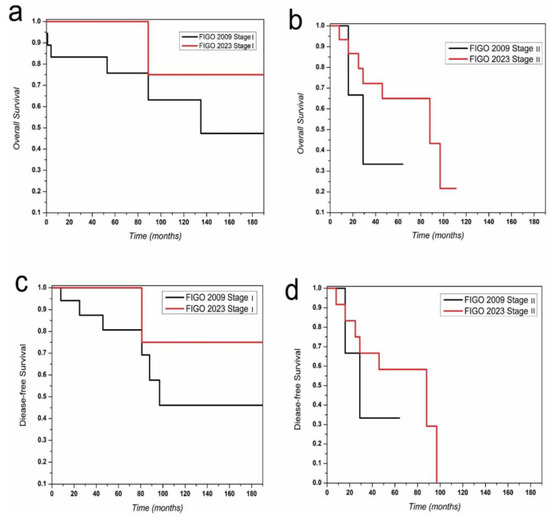 DFS and OS estimates of stages I and II are shown in Figure 3 according to the FIGO 2009 and 2023 staging criteria.