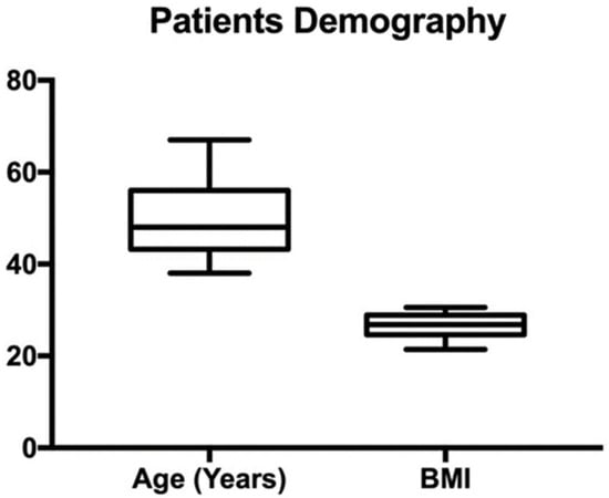 The total duration of the study was 14 months. The first subject was included on 12 January 2019, and the last subject’s last visit was on 14 March 2020. Only enrolled subjects received the investigation device. In total, forty subjects were selected and included in the study. All 40 patients completed the study. All patients were treated at least once with the device under study and were included in the SAF. None of the patients had protocol deviations. Subject demography at Baseline is summarized in Table 1 and Figure 1. All participants in the study were female (100%). The age ranged from 38 to 67 years, with a median age of 48 years. The Body Mass Index (BMI) ranged from 21.4 to 30.6, with a median range of 26.8. All subjects were Caucasian, of Albanian and Italian descent. Most female subjects were of childbearing potential, and pregnancy test results were negative. Figure 1 and Table 1 provide an analysis of the demographic details.