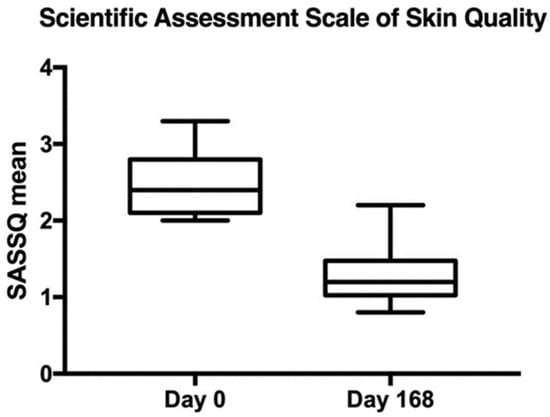 Statistical analyses were conducted using GraphPad Prism 10. Continuous variables were summarized as mean ± standard deviation (SD). The primary endpoint, the change in the Scientific Assessment Scale of Skin Quality (SASSQ) from baseline to Day 168, was analyzed using a Wilcoxon signed-rank test. A p-value < 0.05 was considered statistically significant. There were no missing data or dropouts, as all 40 subjects completed the study.