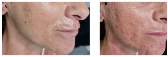 Exogenous or extrinsic variables (chronic light exposure, pollution, ionizing radiation, chemicals, toxins) and endogenous or intrinsic factors (genetics, cellular metabolism, hormones, and metabolic processes) combine to influence the complicated biological process of skin aging []. Together, these elements cause cumulative physiological and structural changes, gradual variations in each layer of the skin, and changes in the look of the skin, particularly in parts of the skin exposed to the sun [,,,,]. In photoaging, a gradual loss of skin elasticity is observed, leading to sagging. Prematurely photoaged skin typically presents with a thickened epidermis, patchy discoloration, deep wrinkles, laxity, dullness, and roughness [,,,,]. This condition is accompanied by a reduction in epidermal turnover, resulting in decreased wound healing capacity and less effective desquamation, especially in the elderly. In contrast, aging due to intrinsic factors is characterized by wrinkled, thin, and dehydrated skin []. Techniques used to counteract these changes include the use of sunscreen creams, peelings, fillers, and mesotherapy [,,].