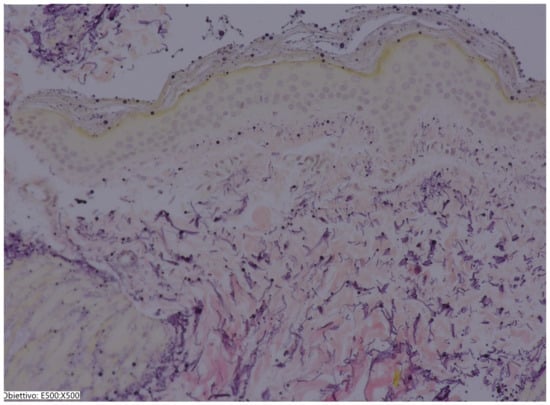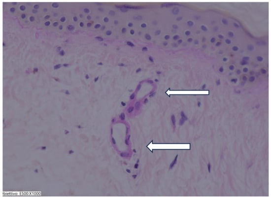 A biopsy of the patient’s skin was taken on day 0 and on day 168 to evaluate the effect of SKIN Colin® on the connective tissue arrangement in the dermis. The biopsies were performed on the cheek or near the lip. Forty biopsies with a 1.0 mm diameter and 3 mm in length were sampled in all patients by means of a specific punch (Kai Medical, Oyana, Japan). For the histological evaluations, 10 fields were selected for each sample, each measuring 2000 × 2000 microns. These evaluations were conducted using a KEYENCE digital microscope (Osaka, Japan). The evaluation was performed by two independent pathologists and evidenced a significant improvement in dermis organization and in the structure of microvessels. An increase in the thickness dermis was observed. Many vessels were detected after treatment. This strongly points out the efficacy of SKIN Colin® in supporting skin health and recovery from damage (Figure 4 and Figure 5). No acute inflammatory cells or tissue necrosis were observed.