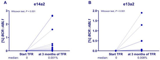 3.2. BCR::ABL1 Transcript Levels in CML Patients with the e13a2 or e14a2 Type in TFR