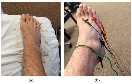 This protocol emphasized 10 points on each lower extremity, with the target tissues being the tibial, medial, and lateral plantar nerves, sural nerve, intermediate dorsal cutaneous nerve, medial branch of the deep peroneal nerve, and lateral dorsal cutaneous nerve. The needles were left in situ for 20 min on each lower extremity, with manual manipulation via four full 360-degree unidirectional needle rotations every 5 min as tolerated. The ITO® ES-160 was used for electrical stimulation, with a preset program varying frequency from 30 to 100 Hz. Research supports both high and low frequencies but notes that low frequencies may be less tolerable to patients with neuropathic pain [25,42,43]. Pulse duration was set at 150 microseconds for appropriate mechanochemical effects and improved patient tolerance (i.e., less pain) [44]. Intensity was increased until described by the patient as “moderate” [43]. The needling locations did not require adjustment for any of the patients throughout their visits; however, the patients’ perceived intensity of “moderate” seemed to increase in later visits, resulting in a graded increase in the intensity of electrical manipulation.