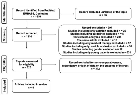 The selection of articles adhered to predefined inclusion criteria, namely (1) studies involving human subjects, (2) full-text articles focused on atrial fibrillation management, (3) studies providing sufficient data on atrial fibrillation presence, and (4) studies with a minimum of 10 participants. Exclusion criteria included the following: (1) non-human studies, (2) case reports, (3) previous reviews or meta-analyses, (4) editorials, (5) studies lacking specific data, (6) studies reporting unrelated outcomes, and (7) studies without relevant data on the targeted aspect.