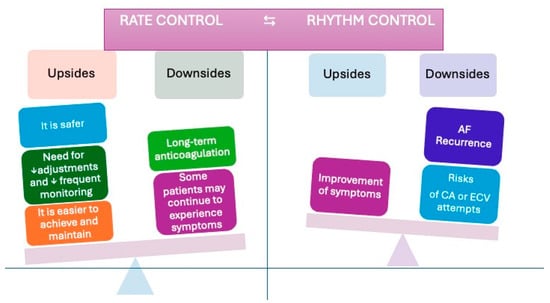 Several studies have demonstrated that both rhythm and rate control strategies effectively manage symptoms and preserve cardiac function in AF patients [35]. However, rhythm control appears to offer potential advantages in early-onset AF (defined as AF ≤ 1 year), although some controversy remains [36,37] (see Figure 3). Electrical cardioversion (ECV) remains the treatment of choice for hemodynamically unstable patients. In contrast, pharmacological cardioversion can be employed in stable patients with a short AF duration [38]. If the onset of AF is uncertain, ECV should be postponed until after at least four weeks of therapeutic anticoagulation with direct oral anticoagulants (DOACs) [38]. Conversely, when AF onset is clearly defined and occurs within 24 h, ECV may be performed immediately under appropriate anticoagulation [38].