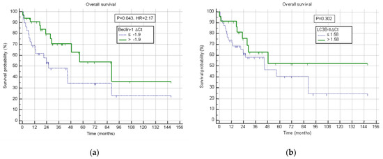| ∆CtBeclin-1 ≥ −1.76 | ∆CtBeclin-1 < −1.76 | p | |