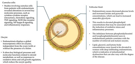The timely and efficient execution of molecular events and pathways through folliculogenesis is thus essential to produce a fertilization-competent oocyte, which can further create an implantation-competent embryo [15,16,17]. Findings from metabolomic studies regarding decreased glucose and increased lactate and pyruvate concentrations in FF indicate the presence of dysregulated energy metabolism and enhanced anaerobic glycolysis [18,19]. Increased oxidative stress and inflammation in the follicular environment can also lead to oxidative damage and impaired mitochondrial function in the oocytes [19]. Studies performed on CCs show that endometriosis can negatively affect follicular growth by creating dysregulations in the molecular pathways involving the CCs’ cell cycle and development, as well as alterations in the mitochondrial energy metabolism, steroid production, apoptosis, and inflammation [20,21]. The transcriptomic analyses of CCs from patients with endometriosis also revealed numerous differentially expressed genes compared with the controls, and the enrichment analysis evidenced altered molecular processes involving cytokine–cytokine receptor interactions, chemokine signaling, TNF signaling, NOD-like receptor signaling, NF-kappa B signaling, and inflammatory responses [22]. A comparison of the oocytes obtained from patients with endometriosis and healthy oocytes by whole-transcriptome profiling using scRNA-seq further resulted in a transcriptomic profile that was associated with lower oocyte quality in ovarian endometriosis [23]. The possible consequences of these adverse molecular changes through endometriosis on CCs, FF, and oocytes are summarized in Figure 1. Recent studies highlighted altered pro-inflammatory anti-inflammatory cytokines in endometriosis patients, which can be prognostic markers of oocyte and embryo quality in women with endometriosis [24]. An analysis of MII stage oocytes obtained from laparoscopically diagnosed endometriosis patients by transmission electron microscopy revealed increased mitochondrial structural abnormalities and reduced mitochondrial content [25]. Altered steroidogenesis also results in an imbalance of sex hormones and disruption of the optimal hormonal milieu required for oocyte maturation and development in endometriosis [26]. Aberrant angiogenesis and vascular function, as well as fibrosis, can, on the other hand, compromise the delivery of oxygen and nutrients to developing oocytes. The consequences of these ovarian microenvironmental changes can be extensive, potentially leading to a reduced follicular pool; impaired oocyte maturation; poor oocyte retrieval; and ultimately, compromised oocyte quality.