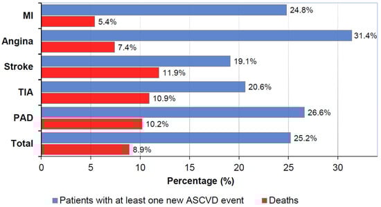| Index Event, n | MI n = 5556 | Angina n = 6794 | Stroke n = 6388 | TIA n = 2184 | PAD n = 6054 | Total ASCVD n = 26,976 |