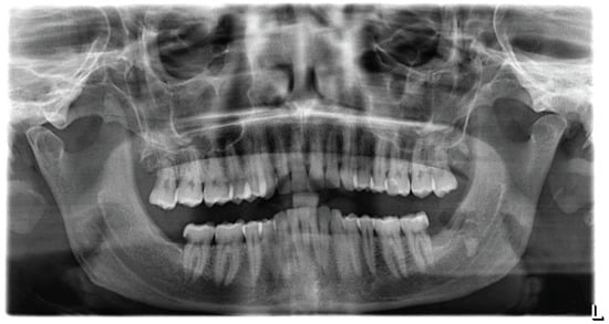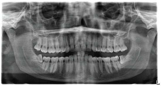 - Nusrath, M.A.; Banks, R.J. Unrecognised displacement of mandibular molar root into the submandibular space. Br. Dent. J. 2010, 209, 279–280. [Google Scholar] [CrossRef][Green Version]