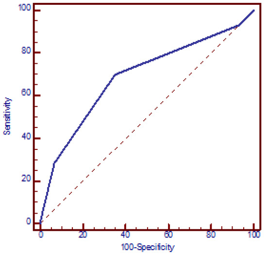 Receiver operating characteristic (ROC) curve analysis assessing the discriminatory power of the number of genetic polymorphisms in relation to recurrent miscarriages. AUC = 0.689 (95% CI: 0.614 to 0.763, p < 0.001). At a cut-off value of two polymorphic genes, the model yielded a sensitivity of 69.8% (95% CI: 65.5% to 73.5%) and a specificity of 65.0% (95% CI: 53.5% to 75.2%).
