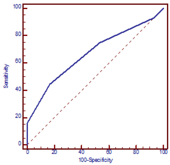 The increased risk of miscarriages with the number of SNPs was confirmed using a logistic regression model. According to this model, the presence of each additional SNP resulted in a mean 2.2-fold increase in the OR for miscarriages (95% CI: 1.5 to 3.2, p < 0.001) (beta = 0.78). The discriminatory power of the four polymorphic genes in identifying women with miscarriages was assessed using an ROC curve, which yielded an AUC of 0.689 (95% CI: 0.614 to 0.763, p < 0.001). The presence of ≥2 polymorphic genes exhibited the best functional characteristics, with a sensitivity of 69.8% (95% CI: 65.5% to 73.5%) and specificity of 65.0% (95% CI: 53.5% to 75.2%) and OR = 4.3 (95% CI: 2.3 to 8.0, p < 0.001) (Figure 2).